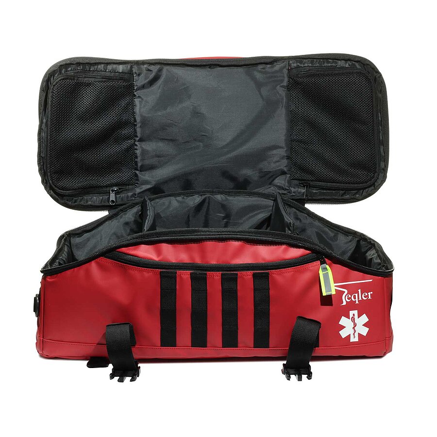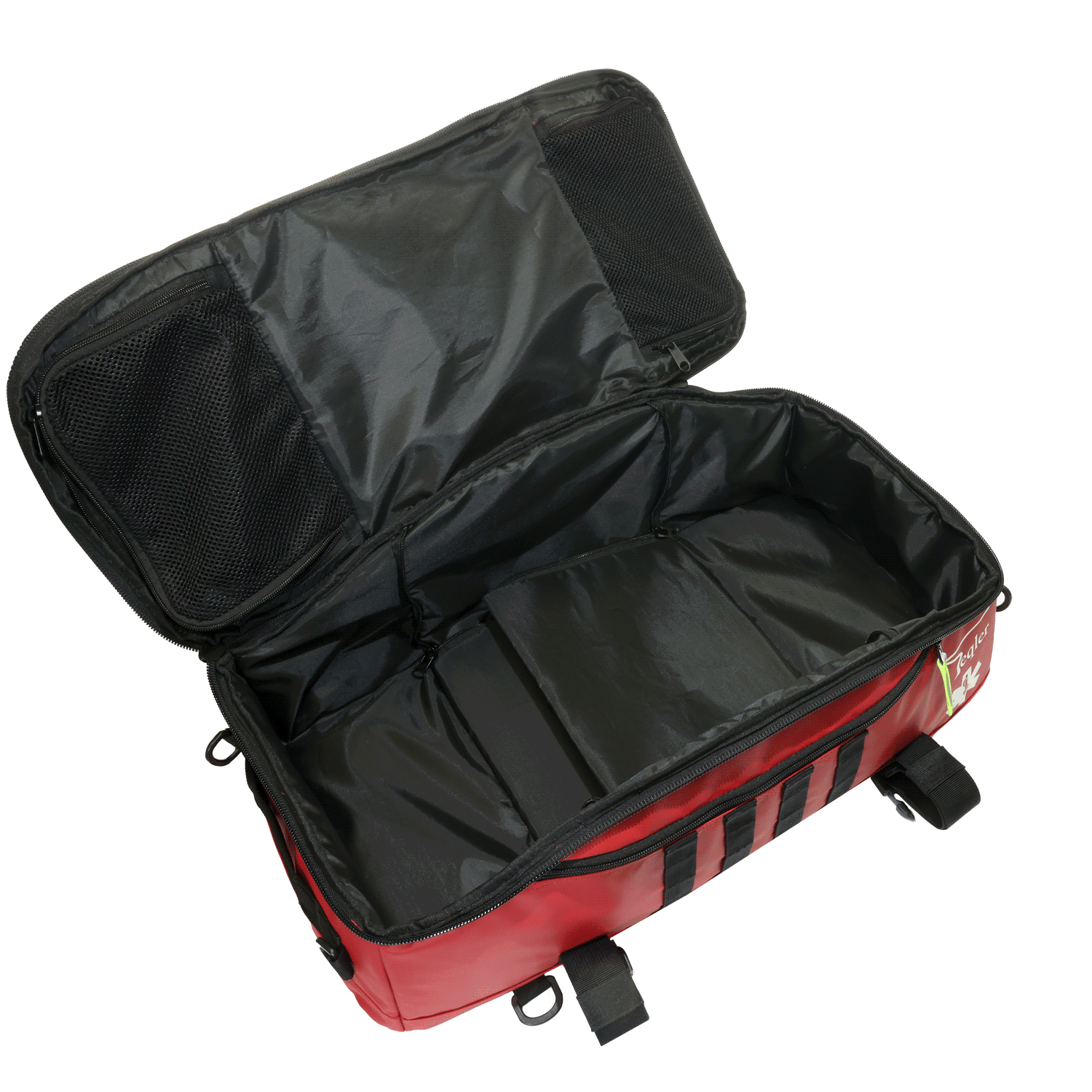 Das großzügige Hauptfach und die zusätzlichen Front- und Seitenfächer bieten ausreichend Stauraum für alle notwendigen Materialien im Notfall. Die leichtgängigen Reißverschlüsse ermöglichen einen schnellen Zugriff, selbst in dringenden Situationen. Das Hauptfach ist durch Trennstege unterteilbar und fast vollständig zu öffnen. Im Deckel befinden sich zudem zwei Netztaschen für kleinere Zubehörteile oder Verbrauchsmaterialien.