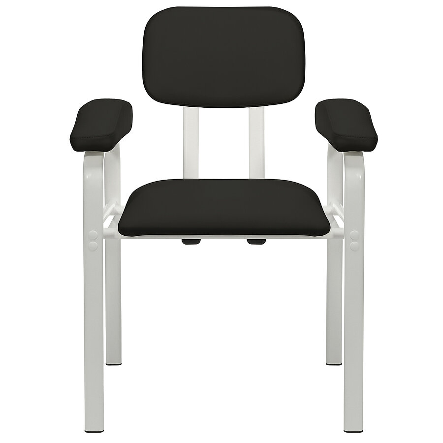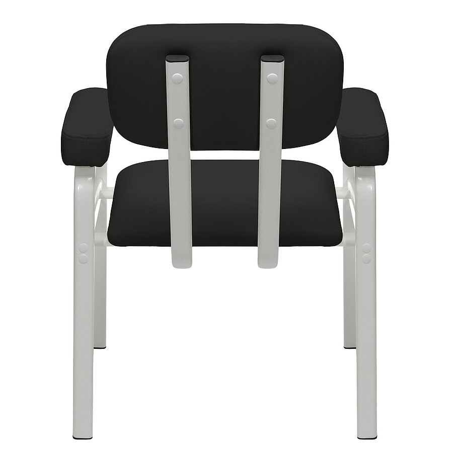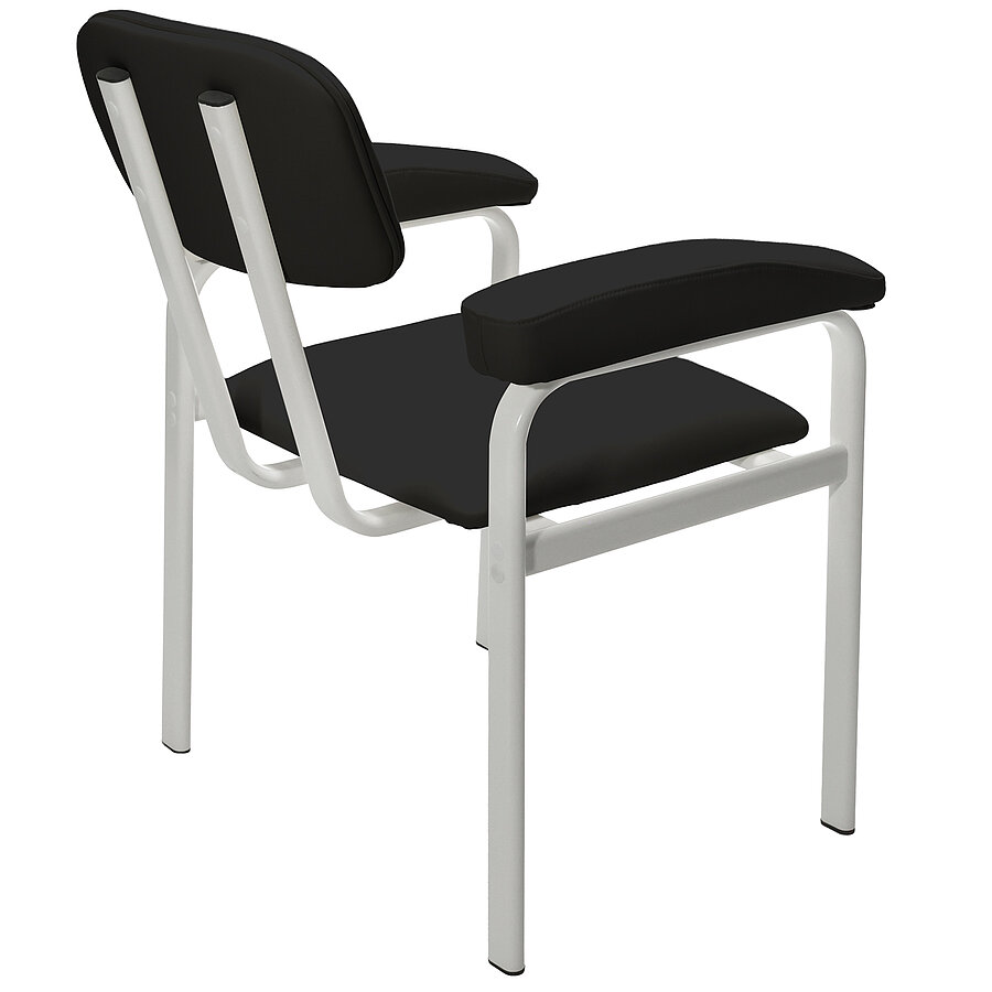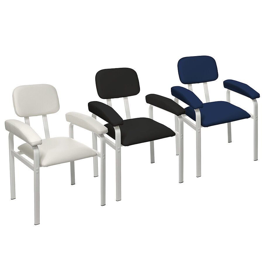 Das Gestell aus Flachovalstahlrohrprofilen bietet eine ausgezeichnete Stabilität und ist bis zu 150 kg belastbar. Mit einer Sitzbreite von 47 cm und einer Sitzhöhe von 50 cm eignet sich der Stuhl auch für größere Patientinnen und Patienten. Die verwendeten Materialien sind beständig gegenüber gängigen Desinfektionsmitteln und lassen sich leicht reinigen, was die Anforderungen an Hygiene und Infektionsschutz im Praxisalltag zuverlässig erfüllt.
