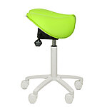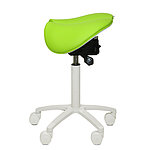 Für zusätzlichen Sitzkomfort sorgt die bequeme Polsterung, die mit einem Kunstlederbezug in den Farboptionen Apfelgrün oder Weiß erhältlich ist. Das stabile weiße Fußkreuz ist mit fünf leichtgängigen Doppellaufrollen ausgestattet, was maximale Flexibilität gewährleistet.