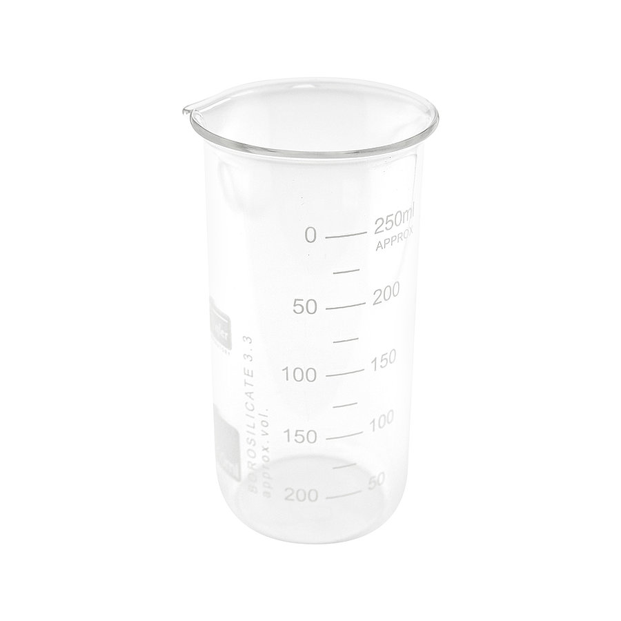 Temperatur- und chemikalienbeständiges Becherglas mit gut ablesbarer, detaillierter Skala. Mit Ausguss zum leichten Umfüllen von Flüssigkeiten. Das Becherglas ist in drei Größen erhältlich.