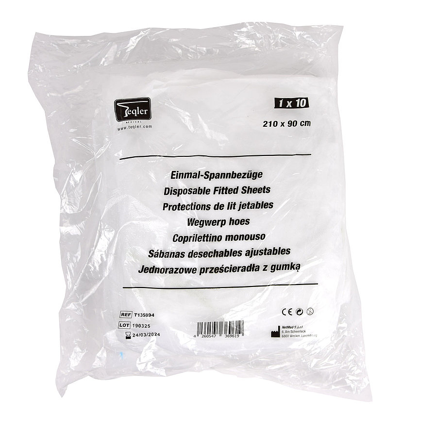 Diese Einmal-Spannbezüge von Teqler können für alle gängigen Patientenliegen bis zu einer maximalen Größe von 210 x 90 cm verwendet werden. Durch Gummizüge an Kopf- und Fußende lassen sich die Vliesbezüge leicht an der Liege befestigen.