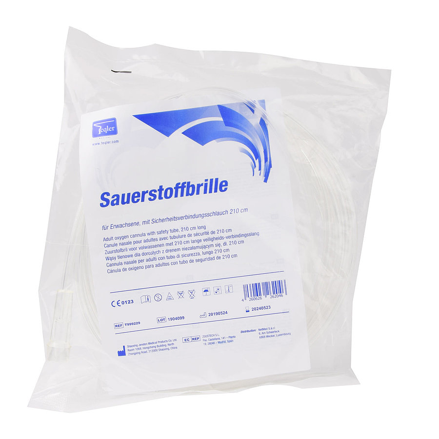 Die Sauerstoffbrille von Teqler ist DEHP- und DOP-frei und mit einem Standard-Konnektor ausgestattet. Sauerstoffbrillen werden zur nasalen Verabreichung von Sauerstoff verwendet. Eine Sauerstofftherapie kann beispielsweise bei der symptomatischen Therapie einer exazerbierten COPD vonnöten sein und mittels Sauerstoffmaske oder Sauerstoffbrille erfolgen, wobei die Nasenbrille wegen des höheren Patienten-Komforts zu bevorzugen ist, wenn eine ausreichende Sauerstoff-Versorgung gewährleistet werden kann.