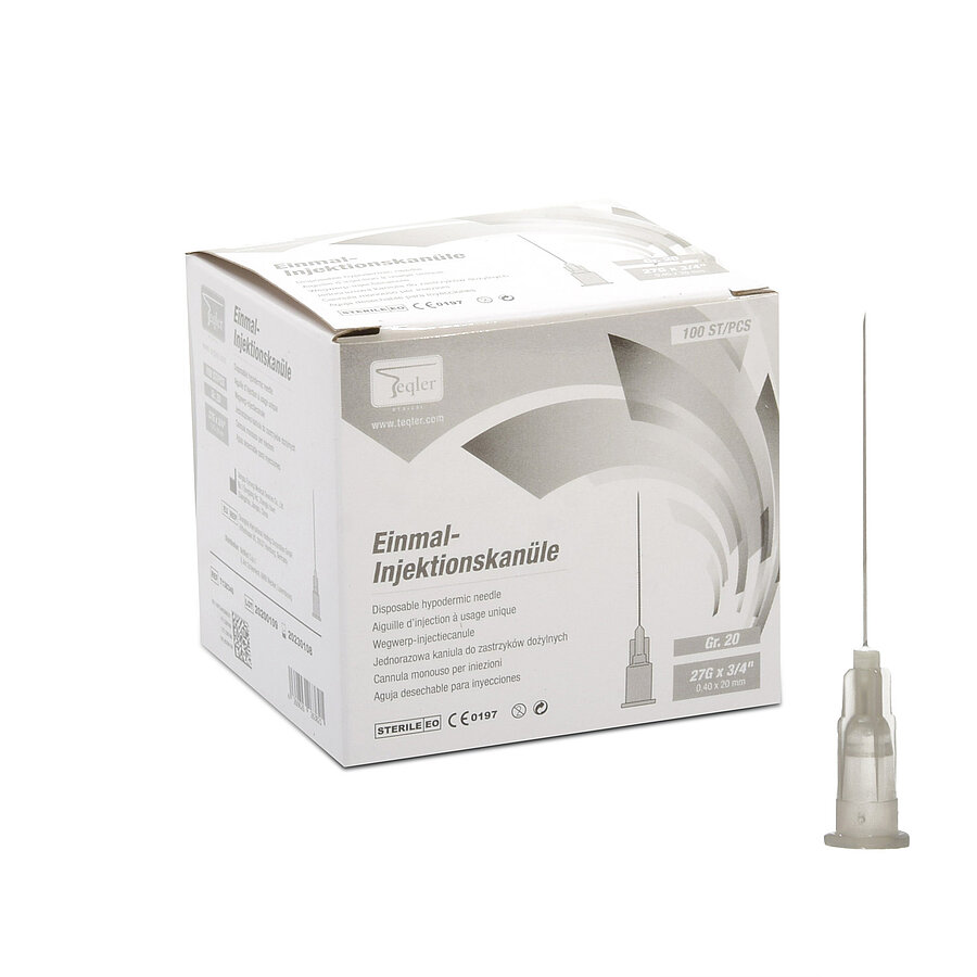 Die Teqler Einmal-Injektionskanülen aus Chrom-Nickel-Stahl verfügen über einen farbcodierten Kanülenansatz. Die Silikonbeschichtung sorgt für eine schmerzfreie Injektion. Erhältlich in verschiedenen Größen.
