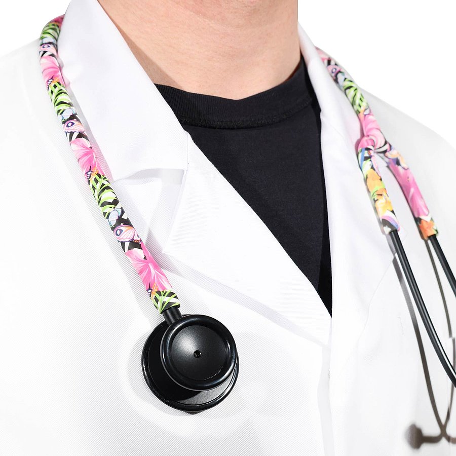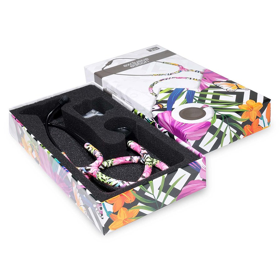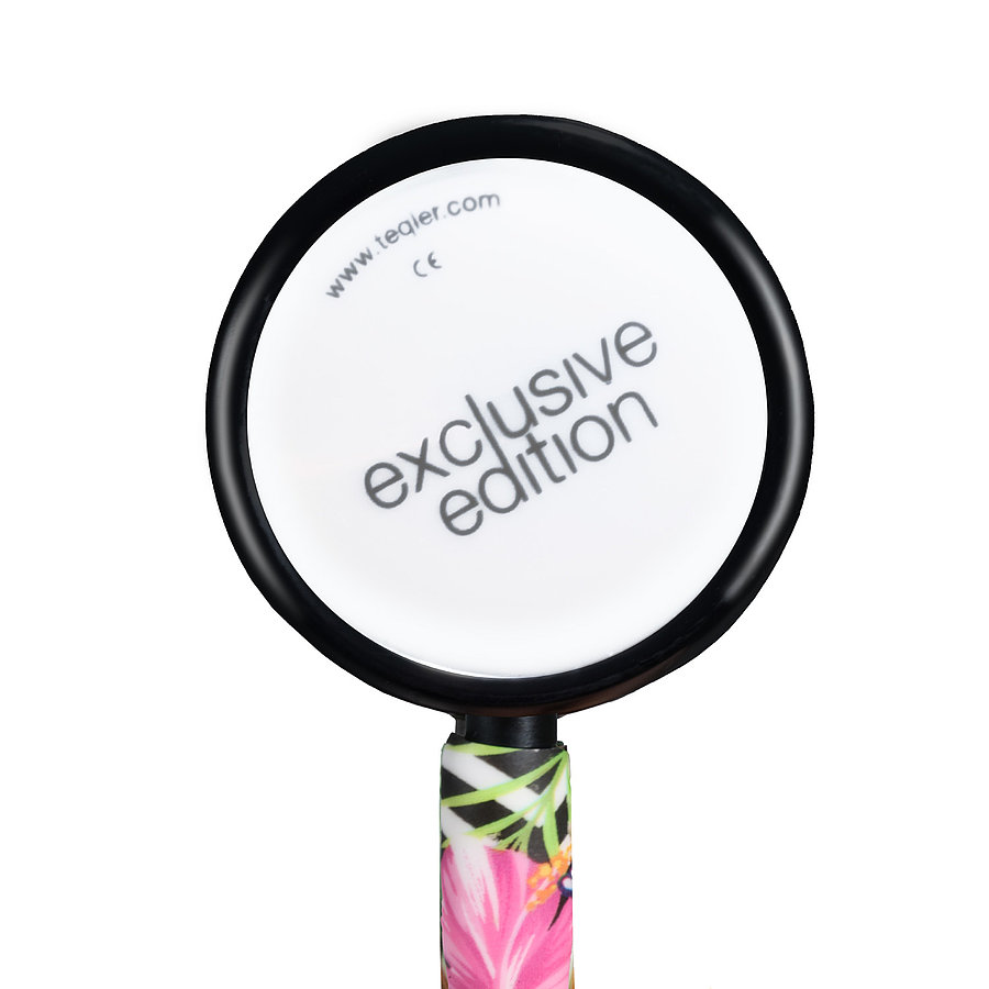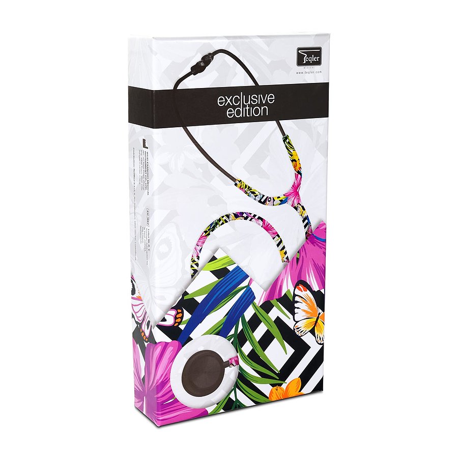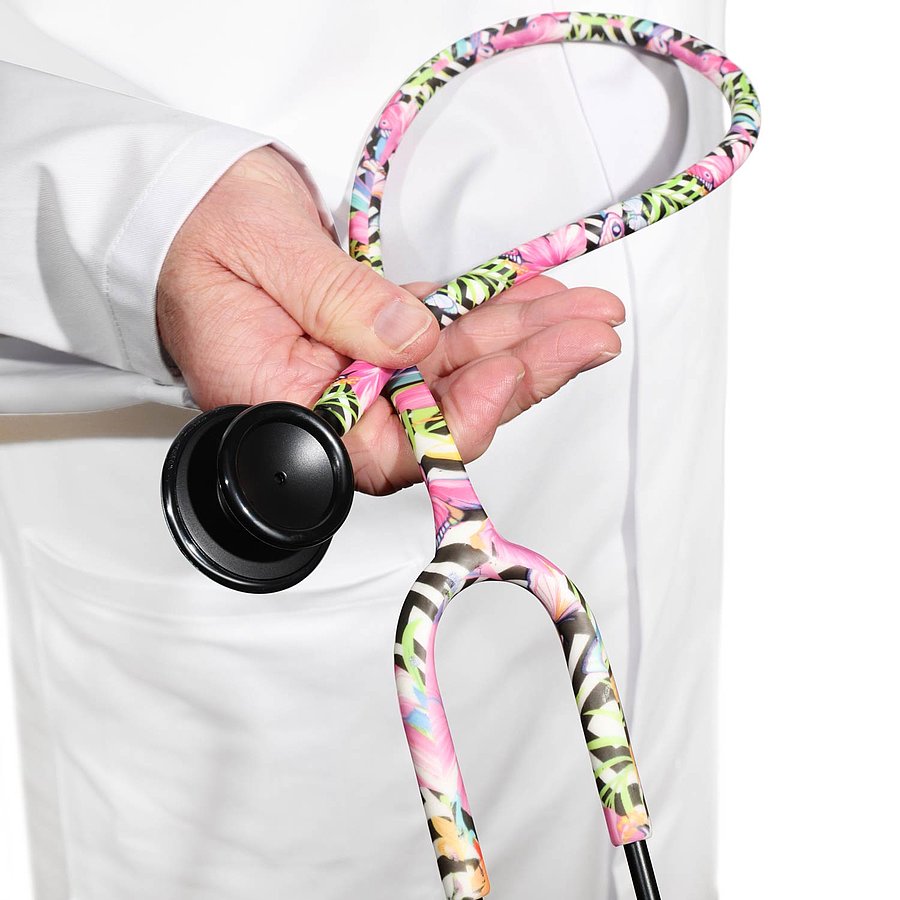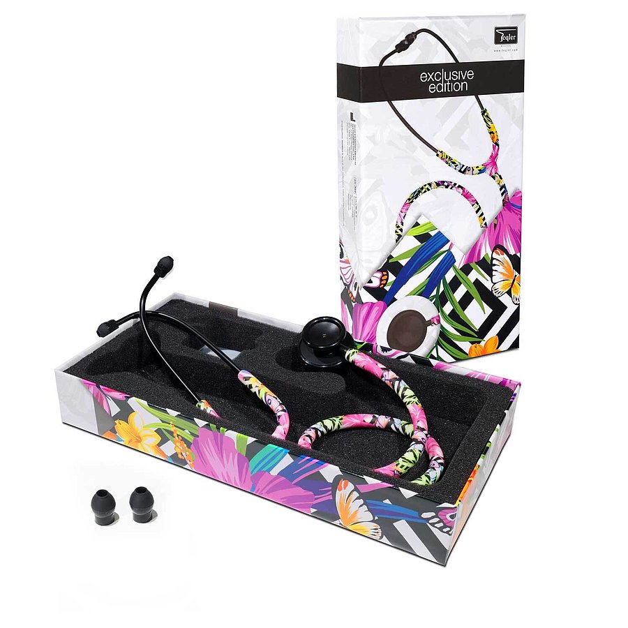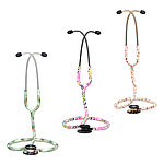 Stethoskop „exclusive edition” mit Kombinations-Bruststück und farbig bedrucktem Schlauch. Das Bruststück besteht aus Membran und Trichter und eignet sich zur Auskultation sämtlicher Frequenzbereiche bei Erwachsenen und Kindern. Die Ohrbügel können an die Bedürfnisse des Anwenders angepasst werden. Die auswechselbaren Soft-Ohroliven ermöglichen eine optimale akustische Abdichtung und angenehmen Tragekomfort.