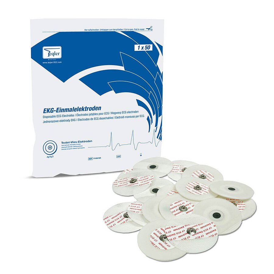 Teqler EKG-Einmalelektroden Vlies für die Verwendung mit Druckknopf-Adaptern. Die hautfreundlichen Elektroden kleben zuverlässig und bieten eine exzellente Ableitungsqualität.