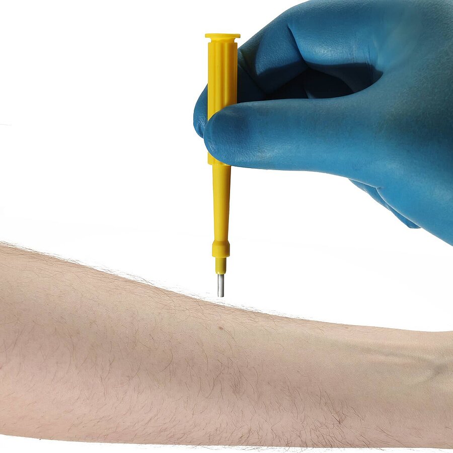 Die geriffelte Oberfläche sorgt für maximale Griffsicherheit und eine saubere Definition der Hautprobe. Die Biopsiestanzen sind einzeln steril im Peel-Pouch verpackt und als Medizinprodukt der Klasse I zugelassen.