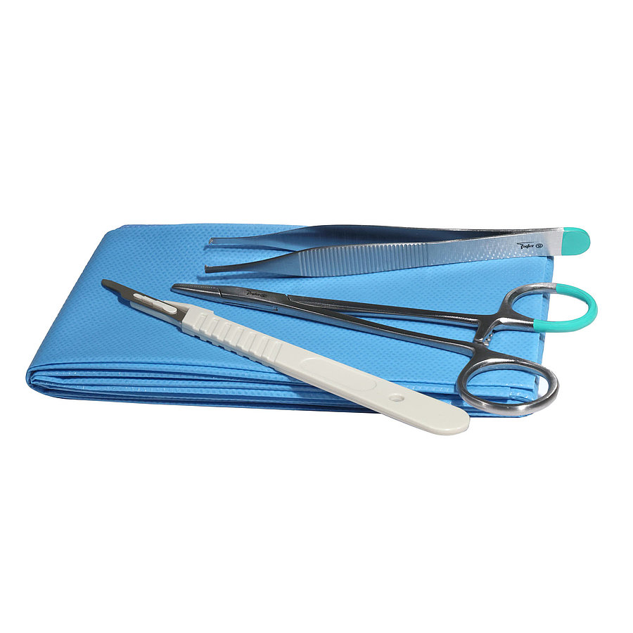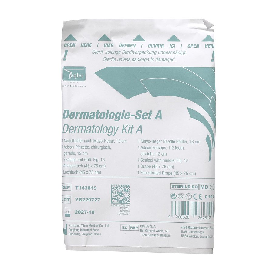 Das Dermatologie-Set A ist ein gebrauchsfertiges Chirurgie-Set zur Entfernung von kleinen Hautveränderungen, wie z. B. Haut- und Weichteiltumore. Neben sterilen Loch- und Abdecktüchern beinhaltet das Set auch chirurgische Einmalinstrumente aus Stahl.