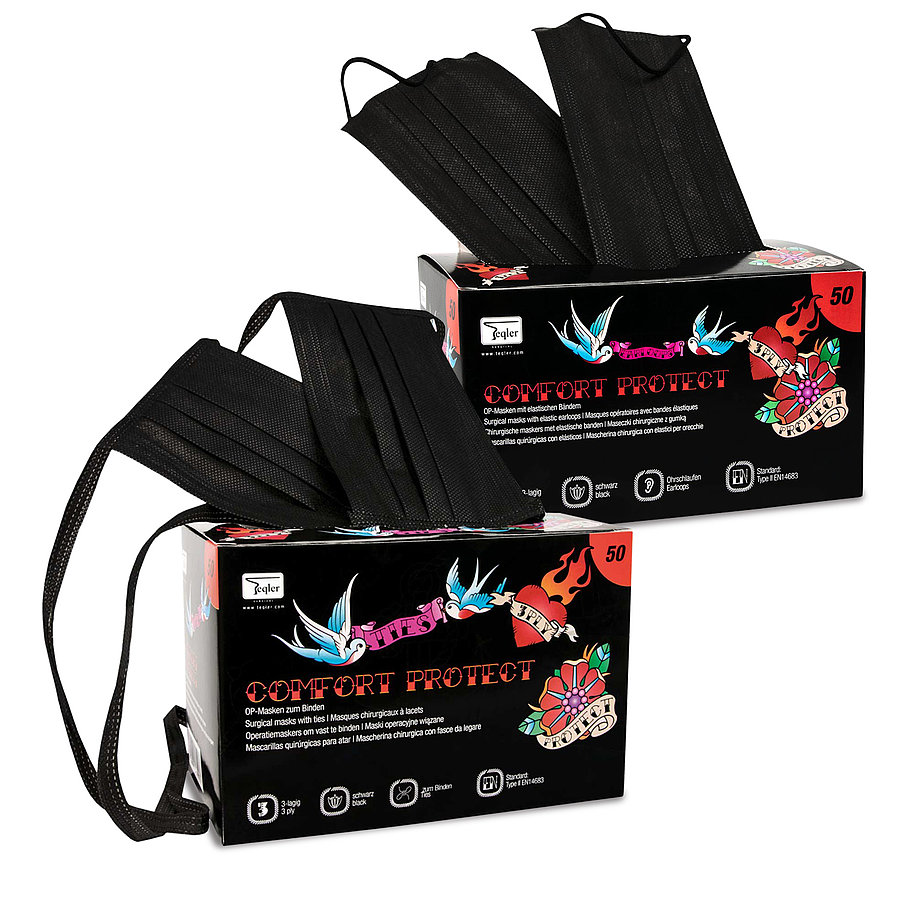 Dieser Mundschutz von Teqler eignet sich durch seine schwarze Farbe und die Spenderpackung im Tattoo-Design besonders gut für Tattoo- und Piercing-Studios. Der Mundschutz ist wahlweise mit elastischen Ohrschlaufen oder mit Bindebändern erhältlich.