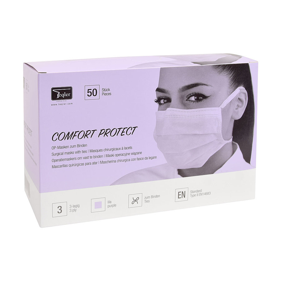 Der OP-Mundschutz von Teqler wird mittels Bändern passgenau befestigt und filtert Bakterien zuverlässig. Erhältlich in verschiedenen Farben.